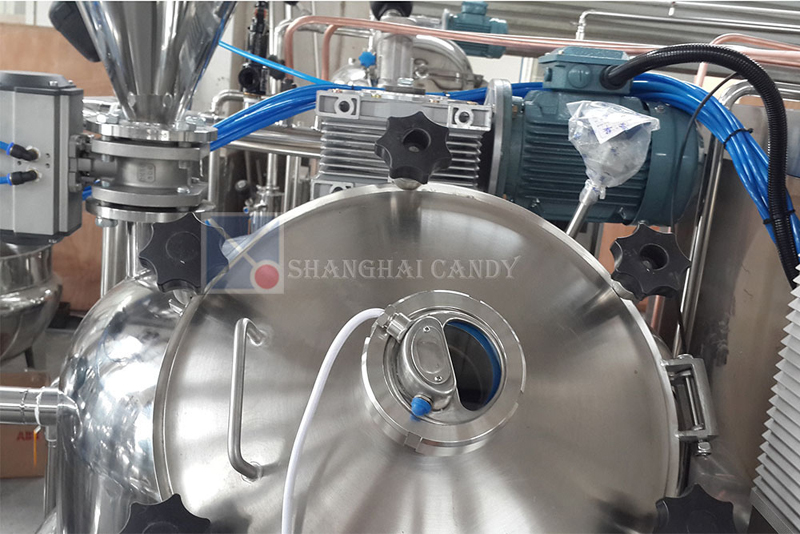 The syrup is pumped from the storage tank to the toffee cooker, then heated and stirred by the rotating scrapes. The syrup is well stirred during the cooking to guarantee the high quality of the toffee syrup. When it is heated to a rated temperature, open the vacuum pump to evaporate water. After the vacuum, transfer ready syrup mass to storage tank through discharge pump. The whole cooking time is about 35 minutes.This machine is reasonable designed, with beauty appearance and easy for operation. PLC and touch screen is for full automatic control.