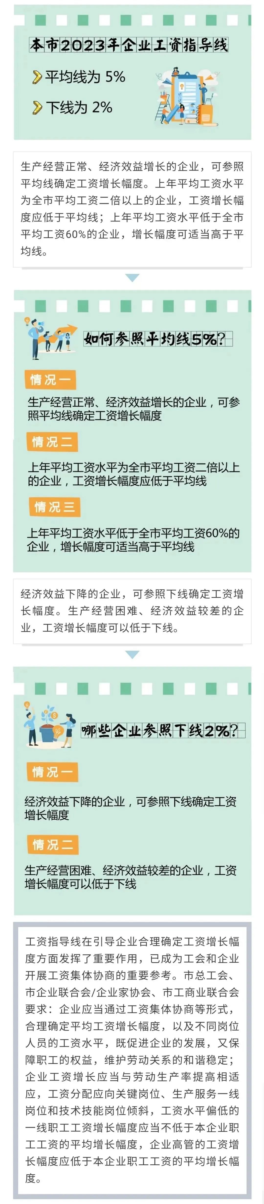 人社局介紹,為引導企業職工工資合理增長,并為企業和職工開展工資集體協商提供依據,經市勞動關系三方共同研究,市總工會、市企業聯合會/企業家協會、市工商業聯合會聯合發布了上海2023年企業工資指導線:平均線為5%,下線為2%。工資指導線有什么作用?如何參照平均線5%?哪些企業參照下線2%?